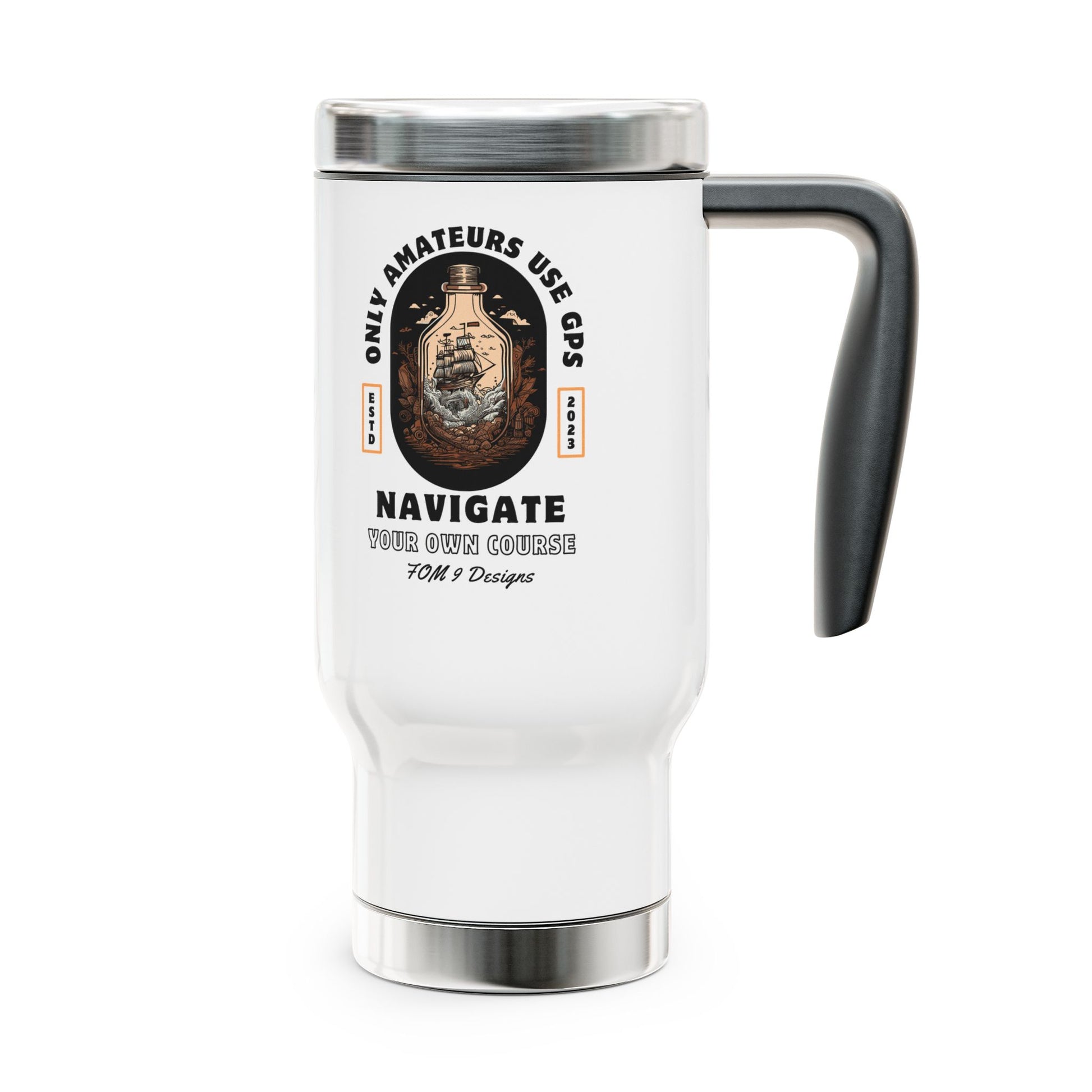 Only Amateurs Use GPS FOM 9 - Stainless Steel Travel Mug with Handle, 14oz